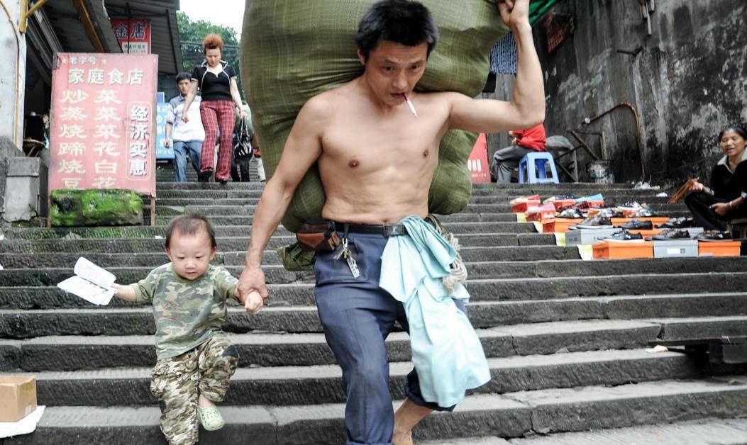 真正让“棒棒”这个行业火遍全国的,是2010年,十一年前的一张“重庆棒棒”的照片。照片的背景是重庆朝天门市场旁的阶梯,照片中是一个中年男子,嘴里叼着一只烟,瘦小的身躯扛着一个比自己还要大的麻袋,麻袋里面装满了货物等着去运送。这在重庆其实并没有什么特别的,但是他另一只手牵着的一个年仅三岁的小孩却吸引了人们的注意。就这样一个带娃扛货的“重庆棒棒”火遍了全网。