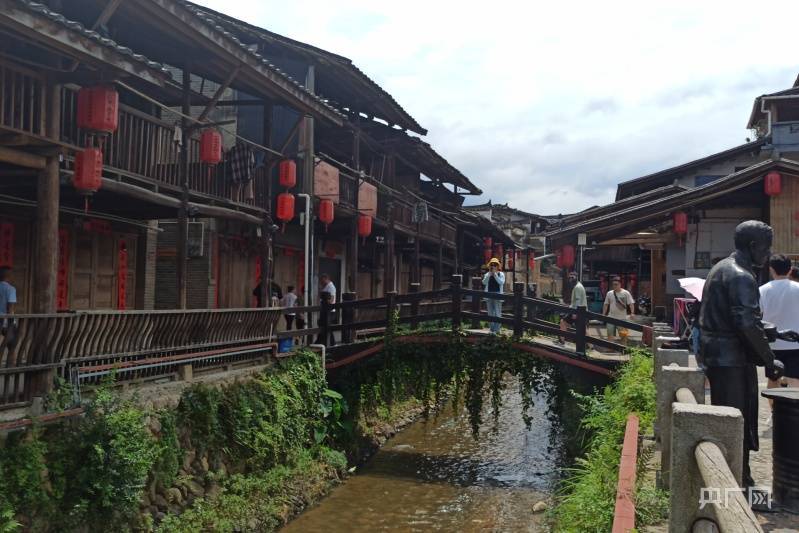 央广网南平7月8日消息(记者罗晓英)凉亭、溪流、美人靠,古街、古井、古建筑……7月5日,记者走进福建省武夷山市下梅村,站在祖师桥上面向下梅村,江南水乡风貌跃然眼前。