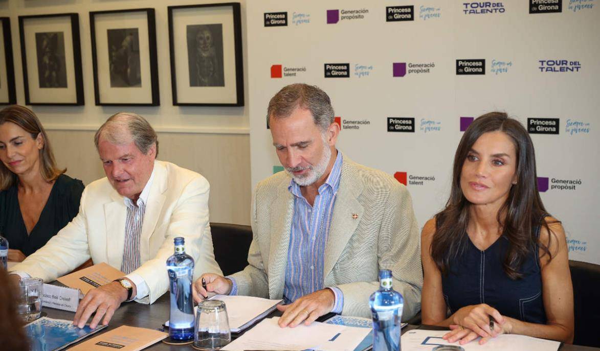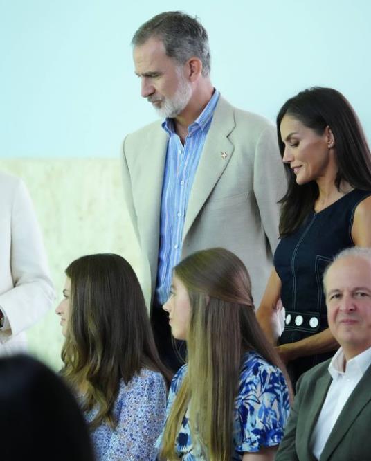 国王夫妇还参加了赫罗纳学院的公主基金会会议,并终于参观了女子班级!莱蒂齐亚王后当天也是一身蓝色,不过她的裙子颜色是深蓝色,布料上没有任何图案,尽显她的高级美。可惜随着两个女儿的长大,跟随母亲的人越来越少。