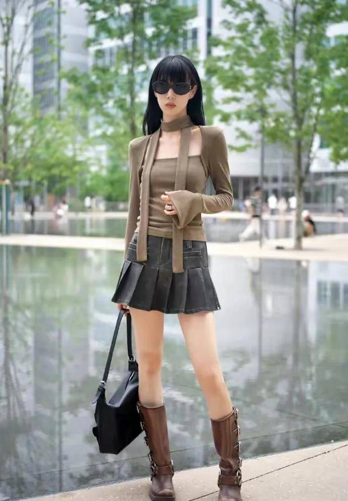 在大多数人看来,“短裙+靴子”的组合可以提高一个人的时尚感,成为一种成功的时尚风格。上衣短裙与靴子的搭配,能够清晰地勾勒出腿部的线条和曲线,让人在合身后呈现出得体干净的整体效果。