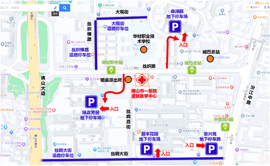 如果患者和家属选择自驾车前往佛山市第一人民医院皮肤医学中心,可以选择以下停车场停车。建议可优先停车于绿嘉芳居及惠泽园地下车库,另外丝织横街及丝绸大街有路边停车位,丝织横街与大观街汇合处东北处有露天停车场,丝绸大街与汾江汇合处西北处有露天停车场可供停车。