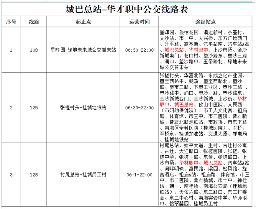 可乘坐108 、125 、128 路公交车,在城巴总站或华材职中站下车,步行50 米到达。
