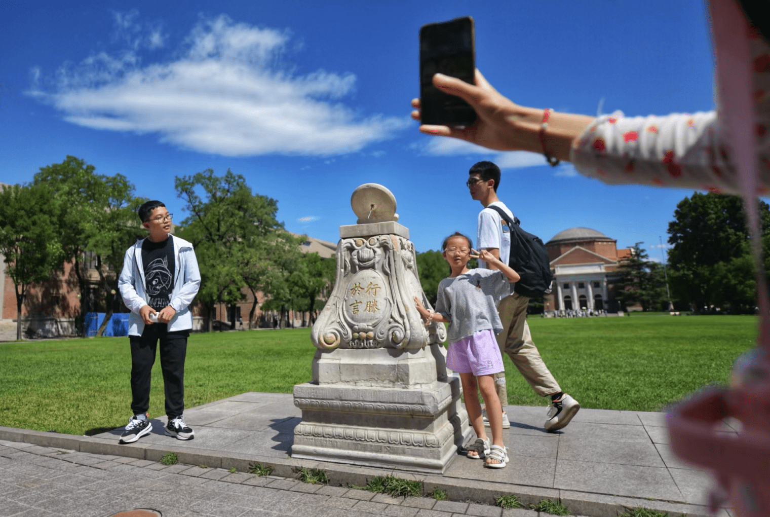 清华也迎来了一组来自成都市的27人游学团,“是学校组织我们来的,还为我们规划了一条游览路线,每个景点都有文字介绍。”小学生刘佳宇拿出校园地图,兴奋地圈出打卡点,“日晷、清华学堂、二校门......还有很多地方没逛到,我们要赶紧出发了!”