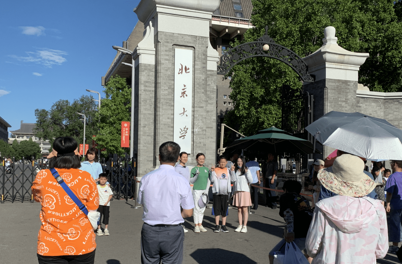 与此同时,北大东门地铁站也已有游客陆续出站,前往东侧门口排队。游客参观通道围起三条围栏,撑起宽大的遮阳伞,为等候入校的游客带来一片清凉。