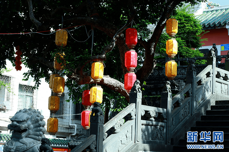 “琼台福地”遗址台阶旁悬挂的彩色灯笼。