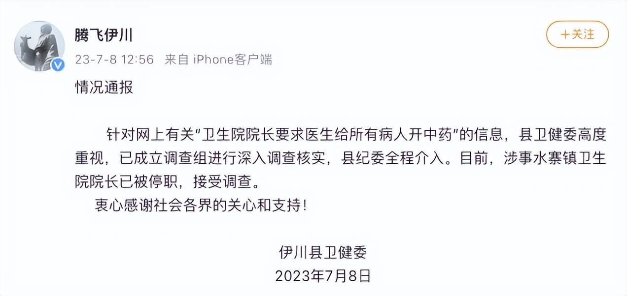 针对网上有关“卫生院院长要求医生给所有病人开中药”的信息,县卫健委高度重视,已成立调查组进行深入调查核实,县纪委全程介入。目前,涉事水寨镇卫生院院长已被停职,接受调查。