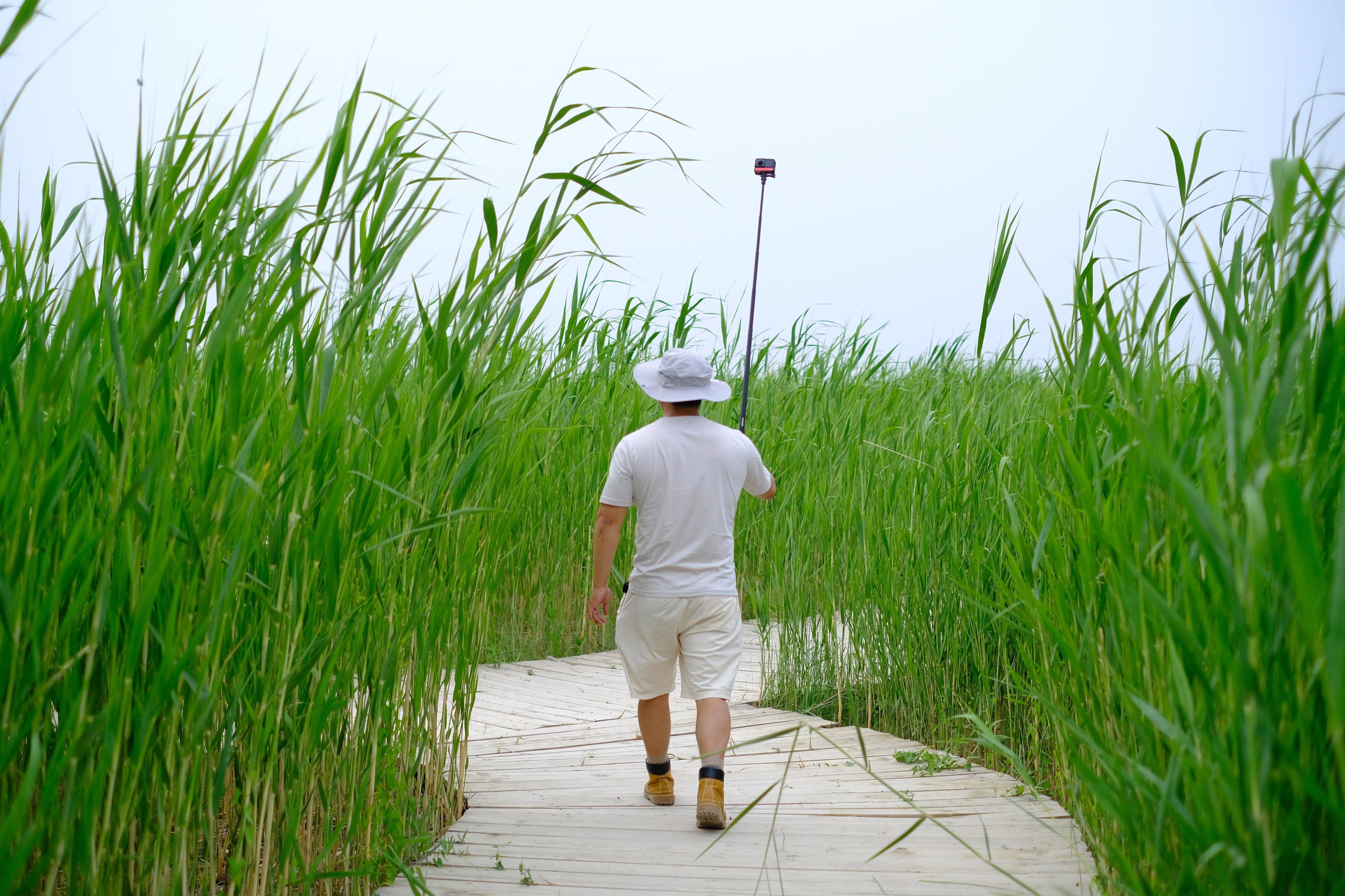 青翠的芦苇竖起一道道天然的屏障,与纵横交错的步行木栈道共同构成一幅巨大的迷宫穿越其中,也不失为一种有趣的体验。高大的芦苇仿佛青纱帐遮蔽了所有人的视线,带来某种神秘之感。