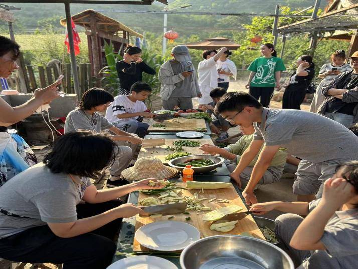 划分完宿营地之后,我们带领学生进行了第一个研学项目——烹饪。同学们在家长的带领下,在庄园内进行蔬菜、野菜的采摘,采摘完毕后同学们集中在一起,将自己采摘到的蔬菜进行分享,使学生们对蔬菜以及野菜的作用以及他们的药用价值,还有他们的使用方法得到了充分的认知。在这儿之后,学生们自己动手操作,将他们采摘到的蔬菜和野菜做成一道