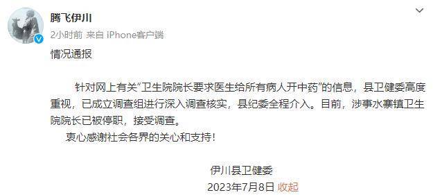 7月8日,河南洛阳伊川县卫健委通报,针对网上有关“卫生院院长要求医生给所有病人开中药”的信息,县卫健委高度重视,已成立调查组进行深入调查核实,县纪委全程介入。目前,涉事水寨镇卫生院院长已被停职,接受调查。