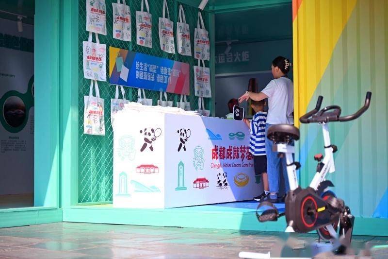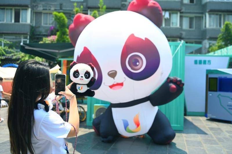 7月8日,以“绿色大运 点亮低碳新生活”为主题的成都大运会低碳办赛系列主题活动在宽窄巷子东广场举行。融合成都大运会低碳交通、低碳场馆、低碳能源等绿色环保举措,创意形成的一体化装置——成都大运会低碳体验馆亮相“营业”,众多往来市民和国内外游客,被现场“闪现”的巨型蓉宝和绿色艺术装置吸引目光。
