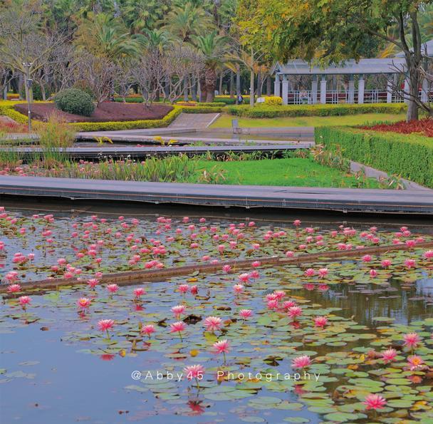要想欣赏睡莲,要先了解下公园分为天园、地园、林园、草园、水花园、滨海风光和星光大道7大景区,并以星光大道为界分为北园和南园。咱们的“报夏使者”就位于海湾公园南园的水花园里。