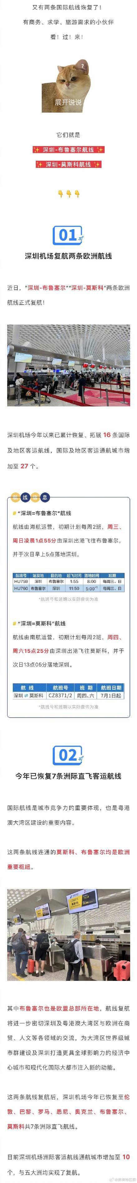 又有两条国际航线恢复了,直飞莫斯科、布鲁塞尔!这两条航线复航后,深圳机场今年已恢复至伦敦、巴黎、罗马、悉尼、奥克兰、布鲁塞尔、莫斯科共7条洲际直飞航线。目前深圳机场洲际客运航线通航城市增加至10个,与五大洲均实现了复航。