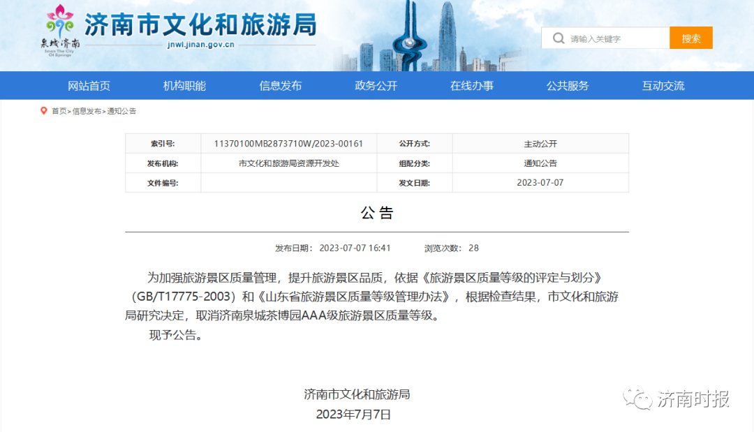 被评为国家AAA级旅游景区不足五年就被“摘牌”。昨天(7月7日)下午,济南市文化和旅游局发布公告, 济南泉城茶博园被取消国家AAA级旅游景区质量等级。