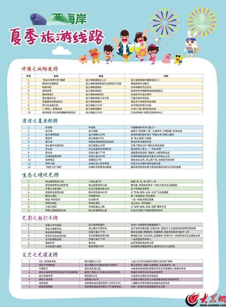 此外,青岛西海岸文化和旅游局结合暑期节点,推出了“青岛西海岸新区”夏季旅游线路,分别为“啤酒之城畅爽游”“清凉之夏度假游”“生态之境观光游”“光影之魅打卡游”“文艺之光深度游”。线路分别以金沙滩啤酒城、青岛东方影都及沿海一线等为重点,整合串联沿海沙滩、生态景区、特色博物馆和美术馆等特色优质资源,为不同旅游群体提供多种选择,极大丰富游客的旅游体验。