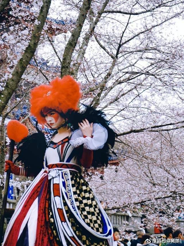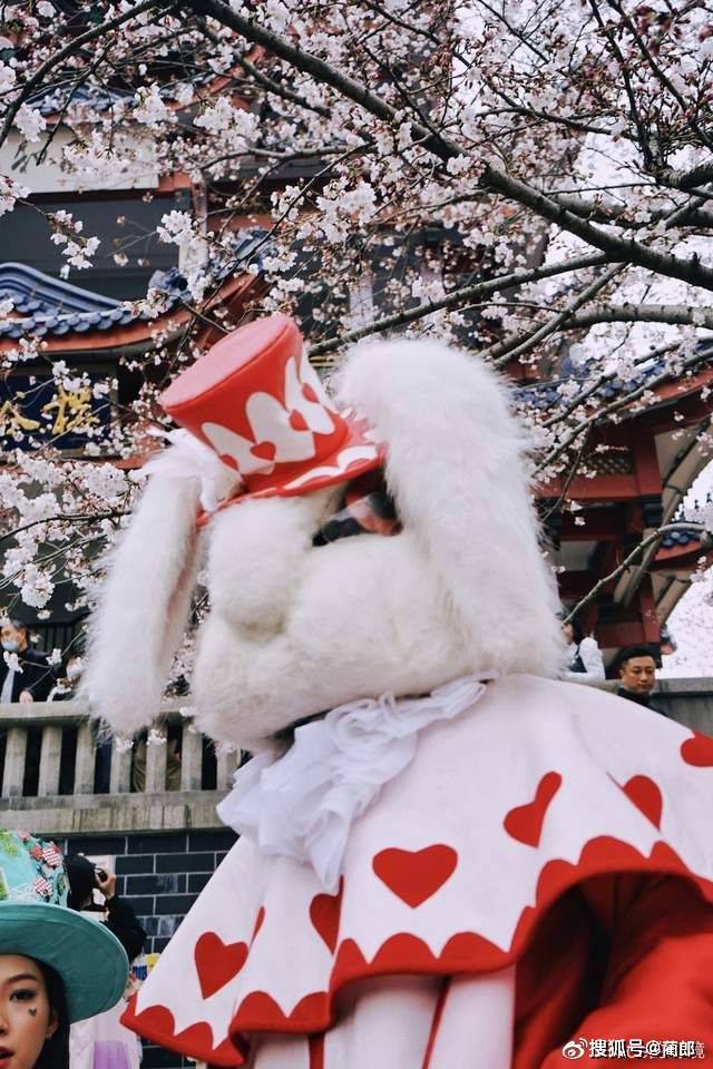 最有趣的是,在景区游玩拍照的时候,会有一些戏剧巡游来到人群中,当时正在赏樱楼看樱花漫天飞舞,突然爱丽丝、踩着高跷的兔子和红桃皇后出现在了眼前,他们和游客互动、合影、表演等,给到我们特别的游园体验和惊喜,很有意思~
