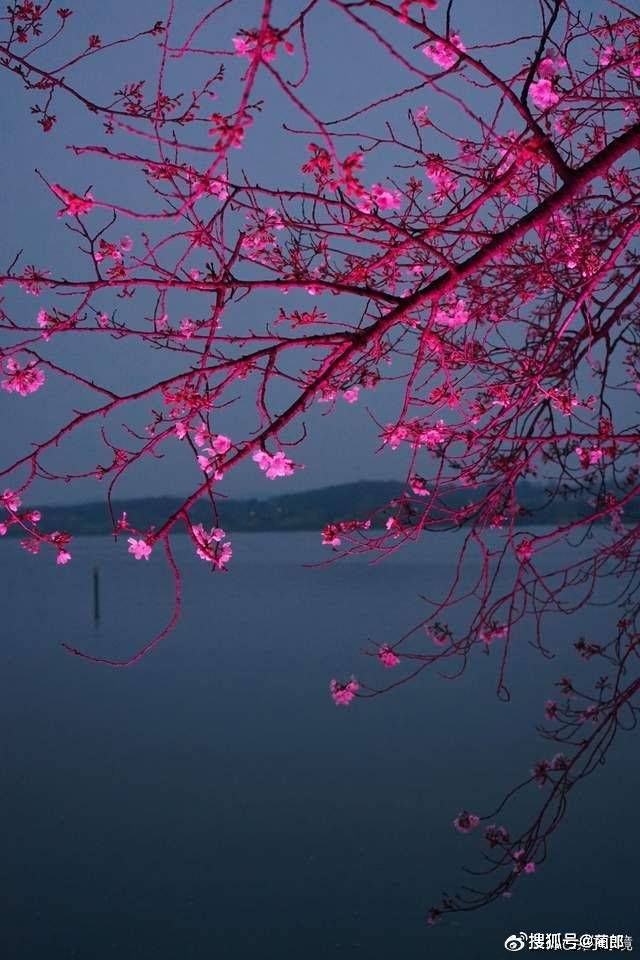 在长春桥畔,湖水倒映出樱花树,一片片的樱林,如仙境一般,在春风飘散的夜晚,闻着丝丝芬芳,看樱花以其绚丽多姿的色彩温暖着夜色。