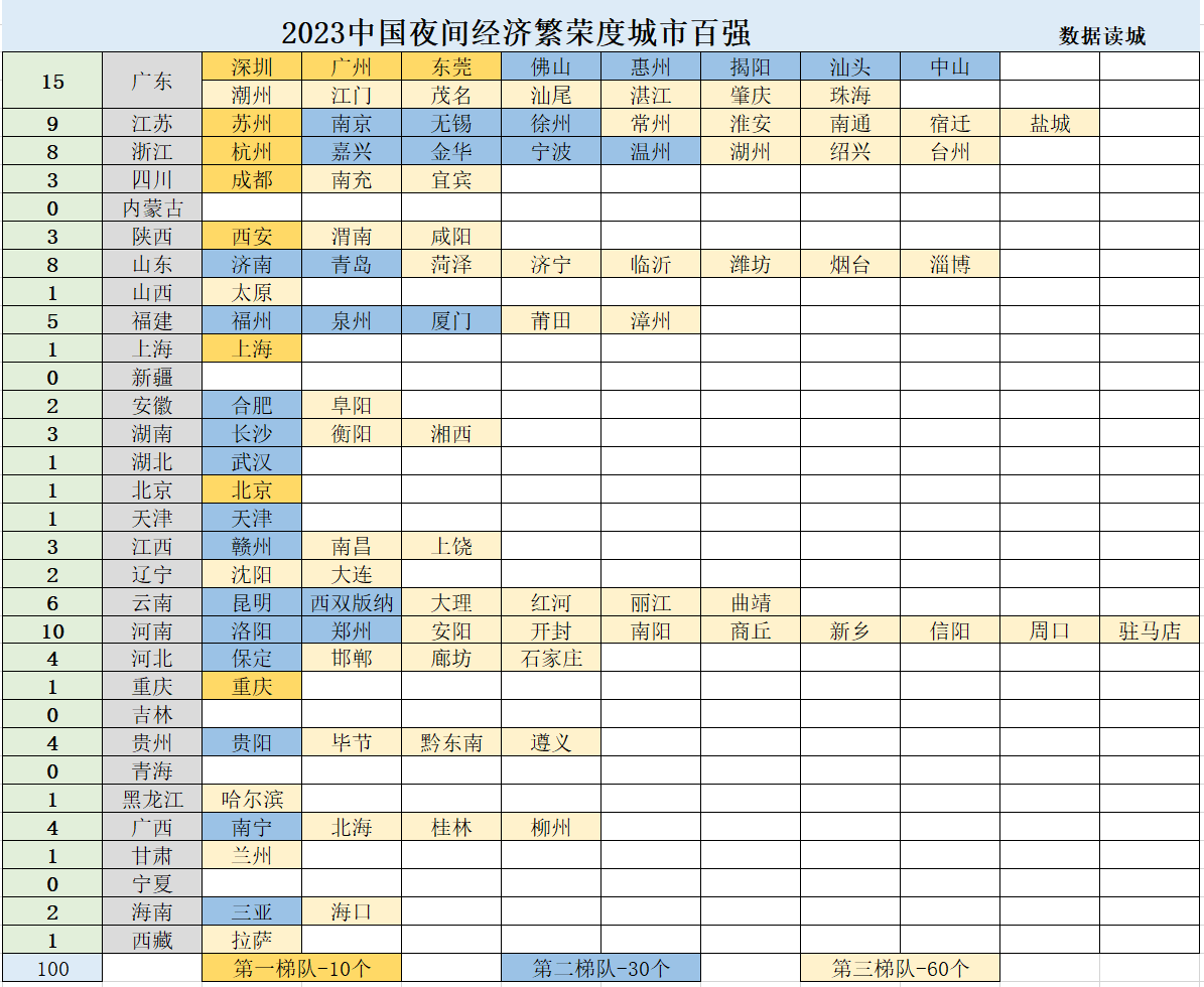最新的夜间经济繁荣度百强城市中,广东以15个城市上榜位居数量第一,河南、江苏和浙江分别以10个、9个、8个城市的数量紧随其后。大部分省市区都以省会城市和重点城市入选,内蒙古、新疆、吉林、青海、宁夏5个西北、东北省区没有城市入选。