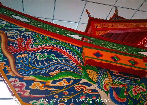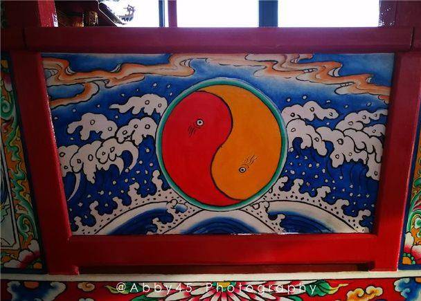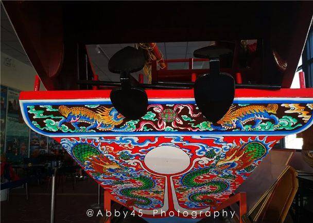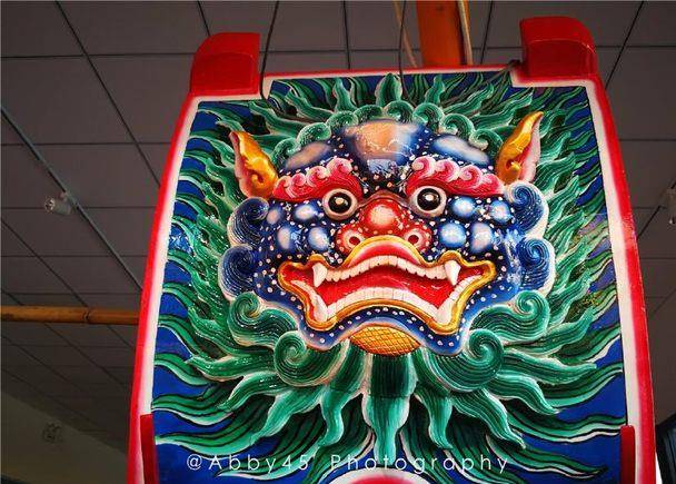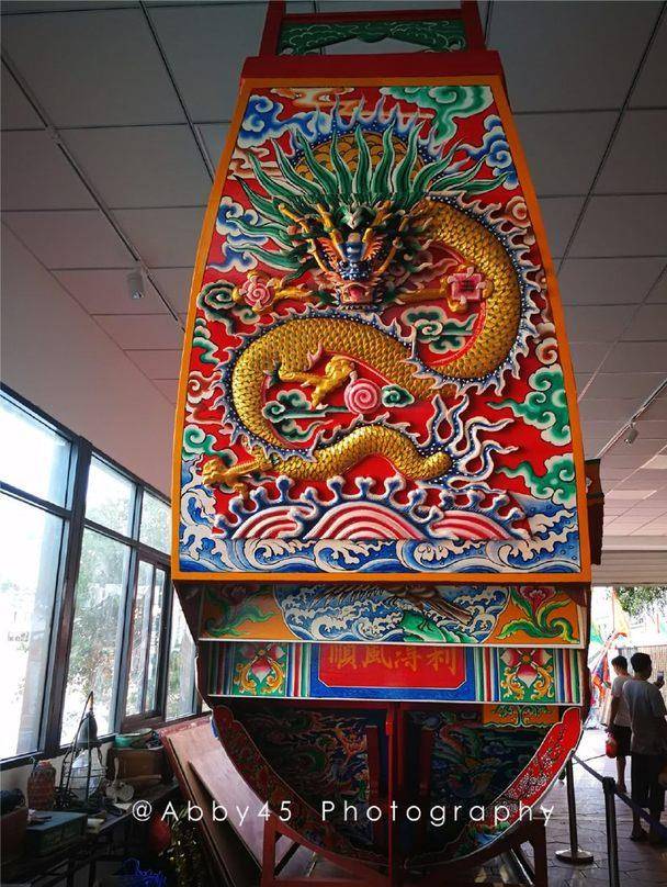 船头正面为狮头图案,并按规矩在两侧插上旗子,此谓左青龙、右白虎。