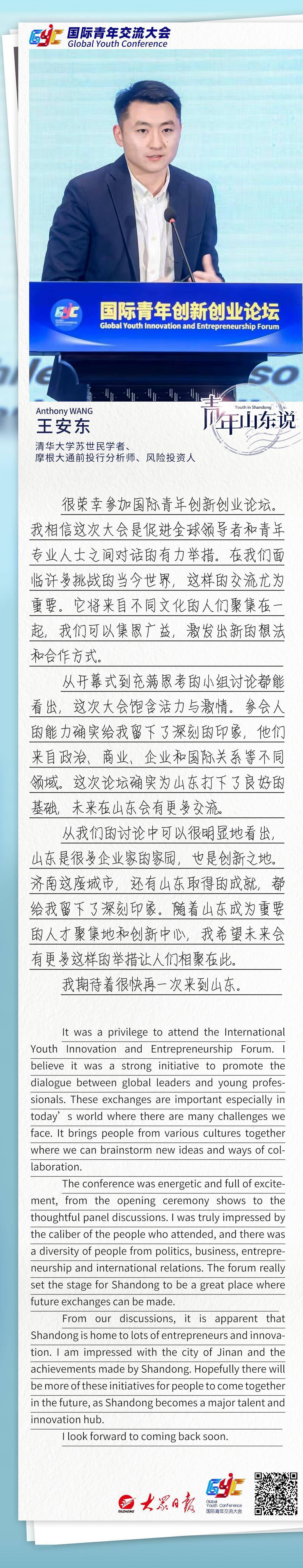 国际青年山东说|清华大学苏世民学者王安东:山东是创新之地