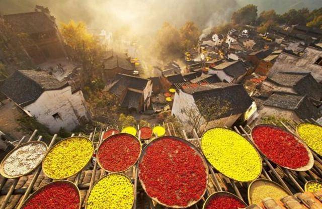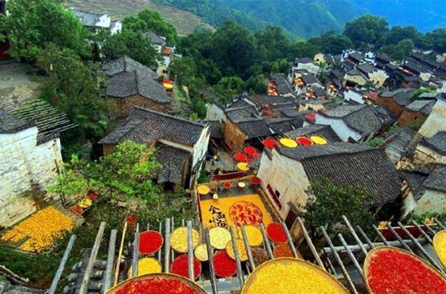 篁岭它美在梯田也美在人家,它那有着数百年历史熏陶的古村错落有致的“挂”在落差近百米高的山坡上,本身就是一种不可多得的美。篁岭村的村民以食为天,每家每户都有自己的一亩三分田,从事种植业的他们,每到了金秋就是他们丰收的时节,家家户户都把收获的农作物晒在屋顶、窗台上形成一幅幅绚丽多彩的画卷。