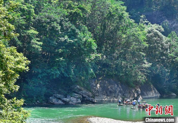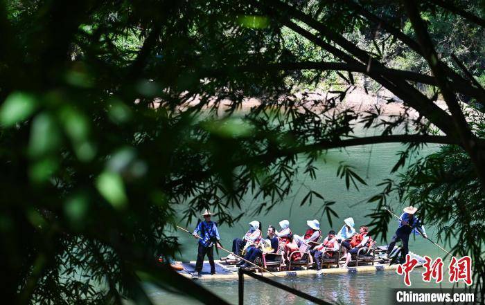 游人乘竹筏漂流九曲溪。 黄杰敏 摄