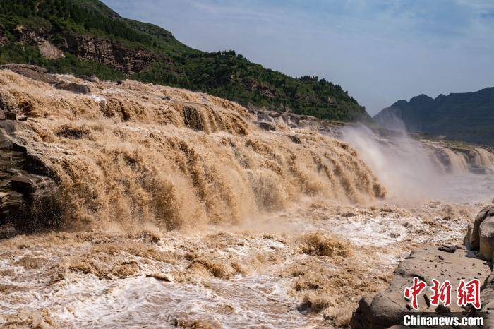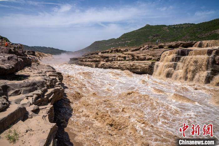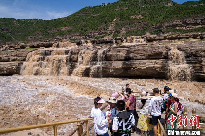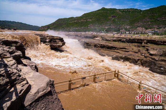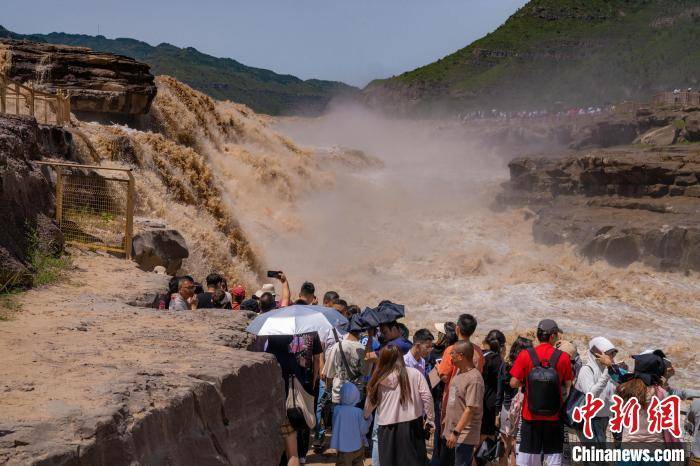 受上游泄洪影响,近日,黄河壶口瀑布迎来洪峰过境。此时,壶口瀑布水流量大增,从空中俯瞰,滔滔黄河水一改往日清瀑飞流景象,携带大量泥沙从上游奔腾而下,如万马奔腾,气势宏伟,在十里龙槽内形成绵延数百米的金黄色瀑布群,勾勒出一幅雄浑壮美的奇观。为保障游客游览安全,景区立即启动防汛应急预案,采取应急管理措施,积极应对洪峰过境。
