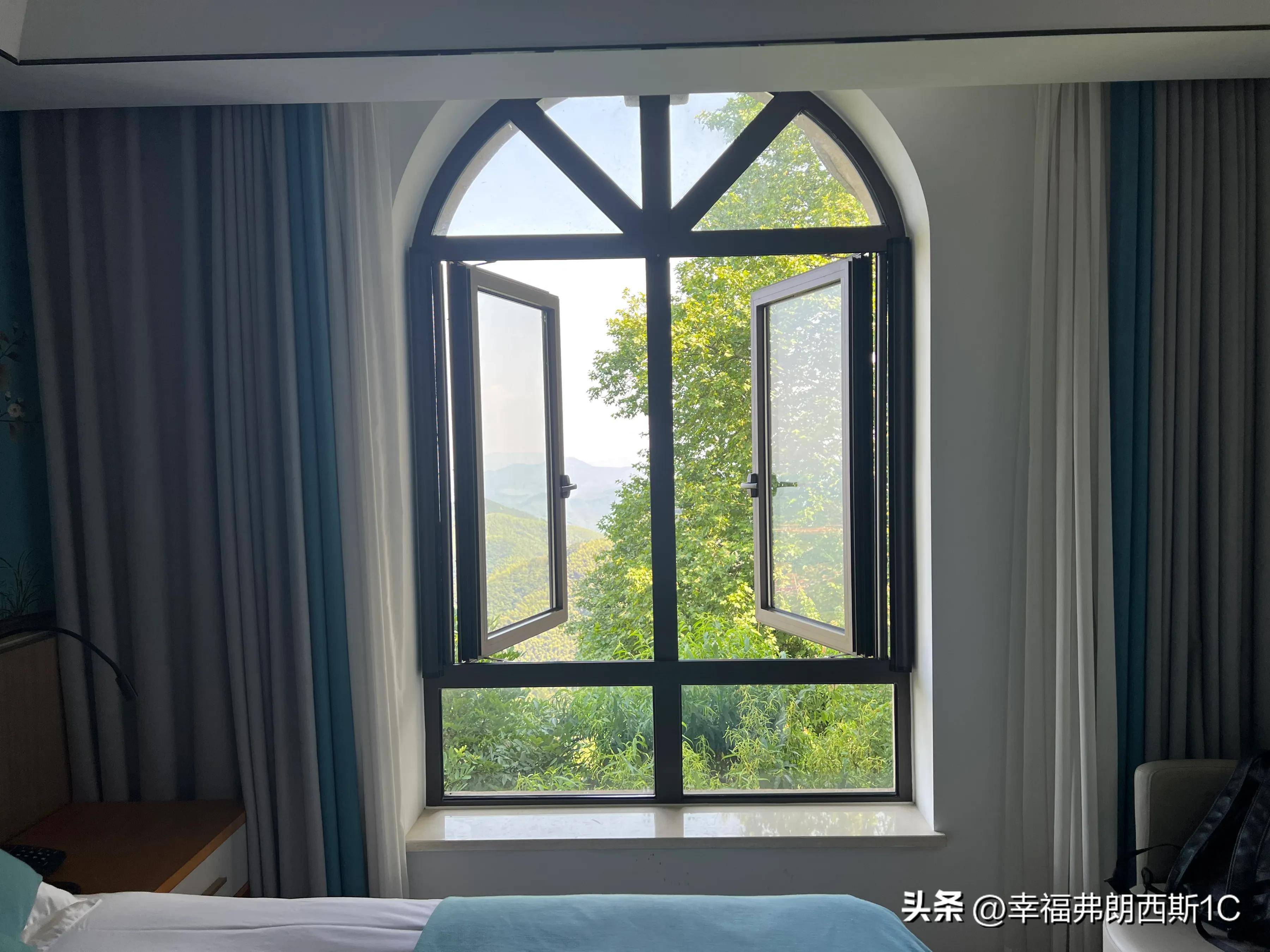 窗外是山,鸟语花香,休闲度假的感觉立刻就会感受到。也有缺点。1、房间下方有马路,开窗的话过往车辆声音较大;2.如果有人把一把椅子拖到房间对面的观景台上,我们就会听到。