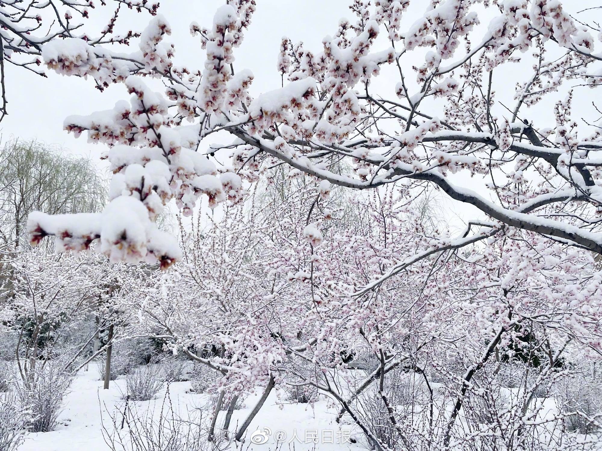 桃花的枝叶上积着一层白雪,眼前一片粉色和白色的世界。