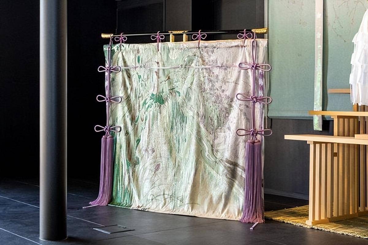 太宰府天满宫还邀请国外时尚品牌MameKurogouchi为临时神社制作了mitobari和kicho,将天神精神和神社的历史融入到设计中。通过将古老的染色方法与现代织布机相结合,创造出了一种独特的织物,代表了文化艺术之神以及神社作为文化中心的意义。该面料以象征天满宫的突出梅花为特色,美丽的颜色和图案渐变代表神社内生命的广度。窗帘采用神社境内的梅花和樟树枝,以及用现代化学纤维编织而成的珍贵紫根,用于丝绸染色。面料中流动的丝线代表了设计师对生命之雨的个人体验。该面料结合了天神和天满宫的历史遗产,融入了神社内盛开的鸢尾花和鲜花等元素,提供了过去与未来之间的联系。