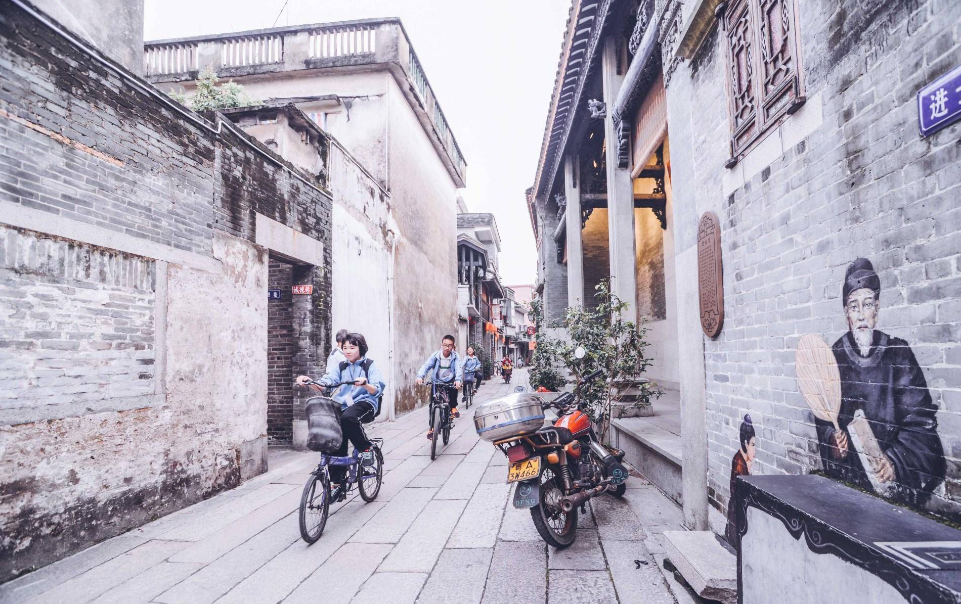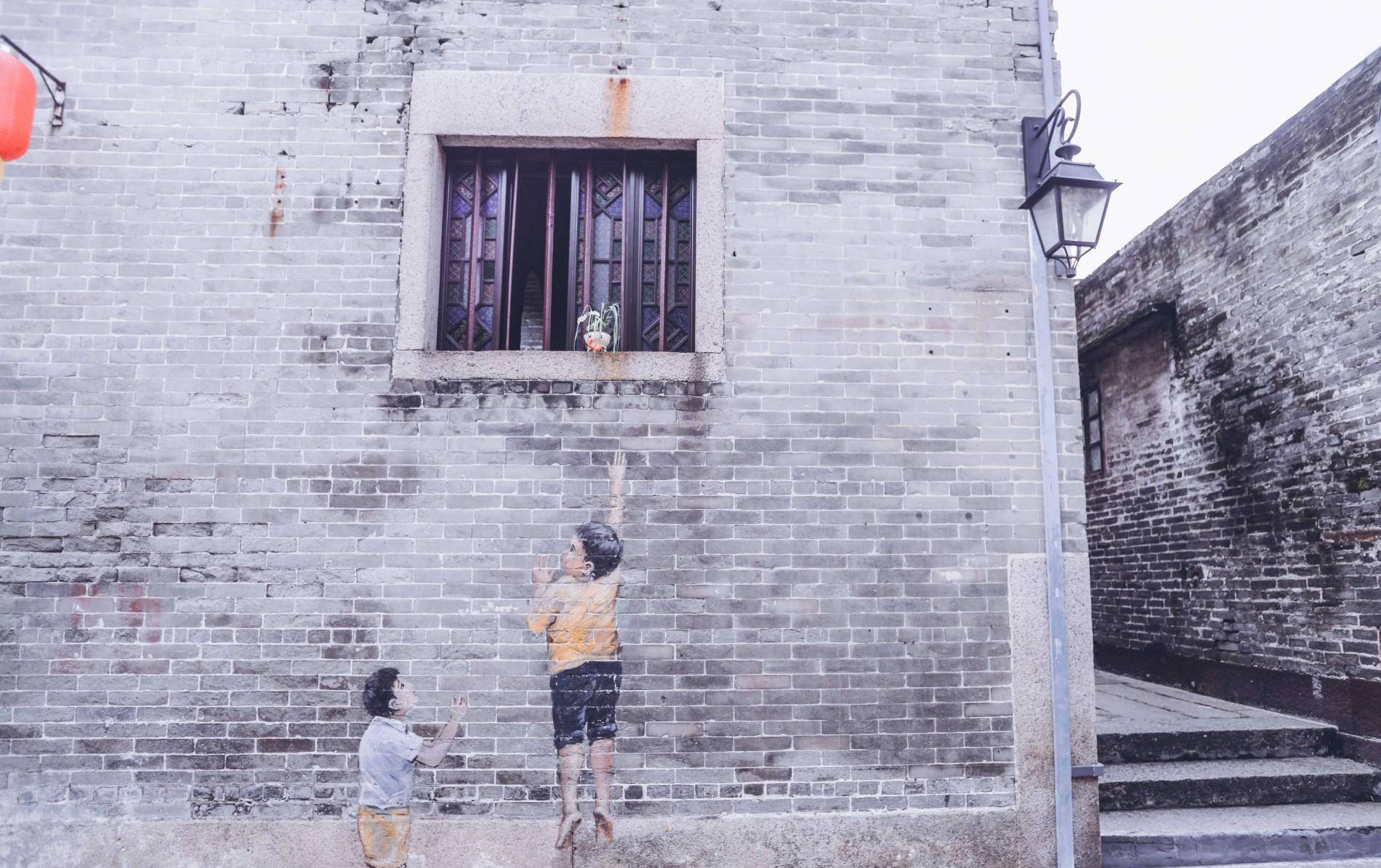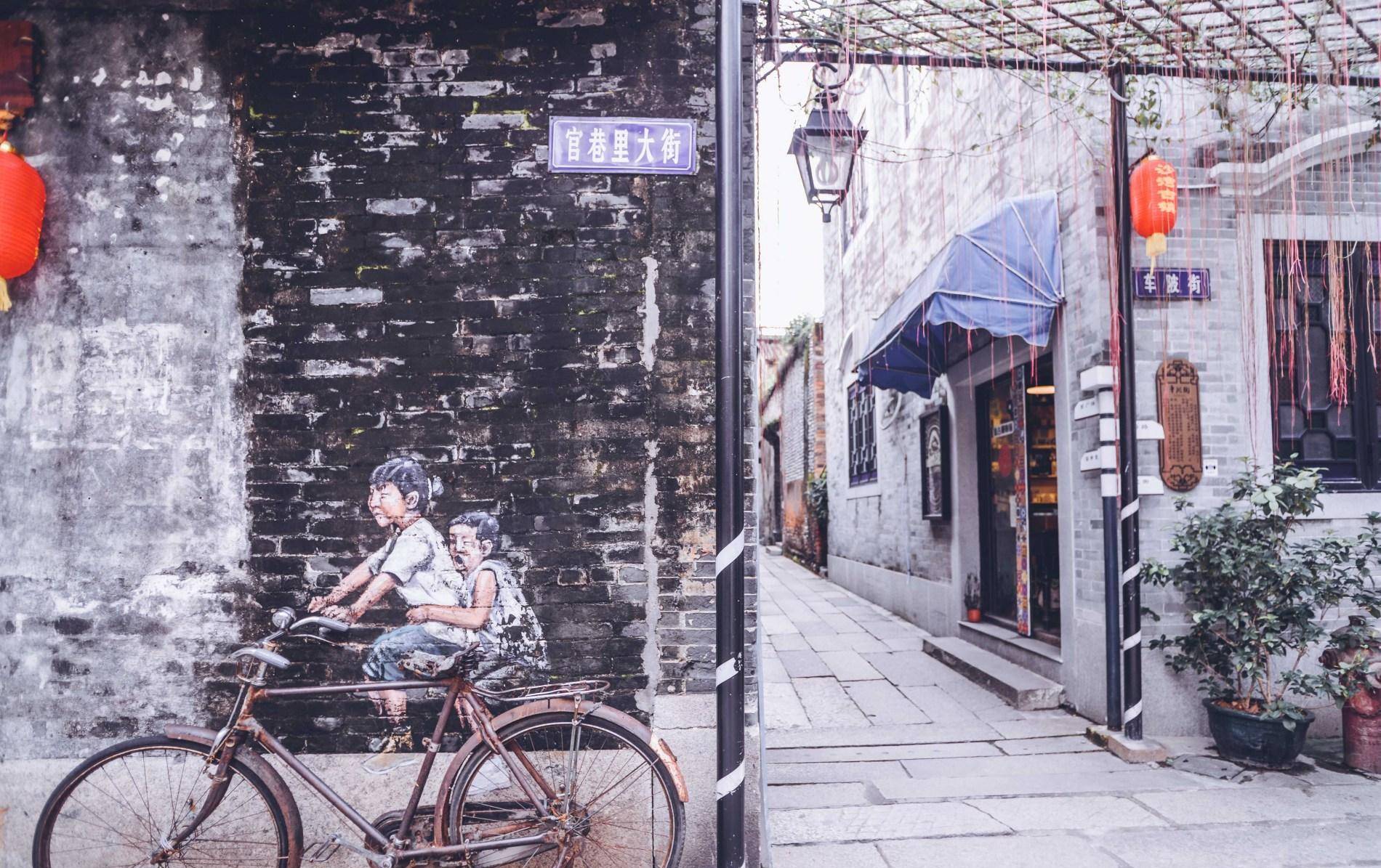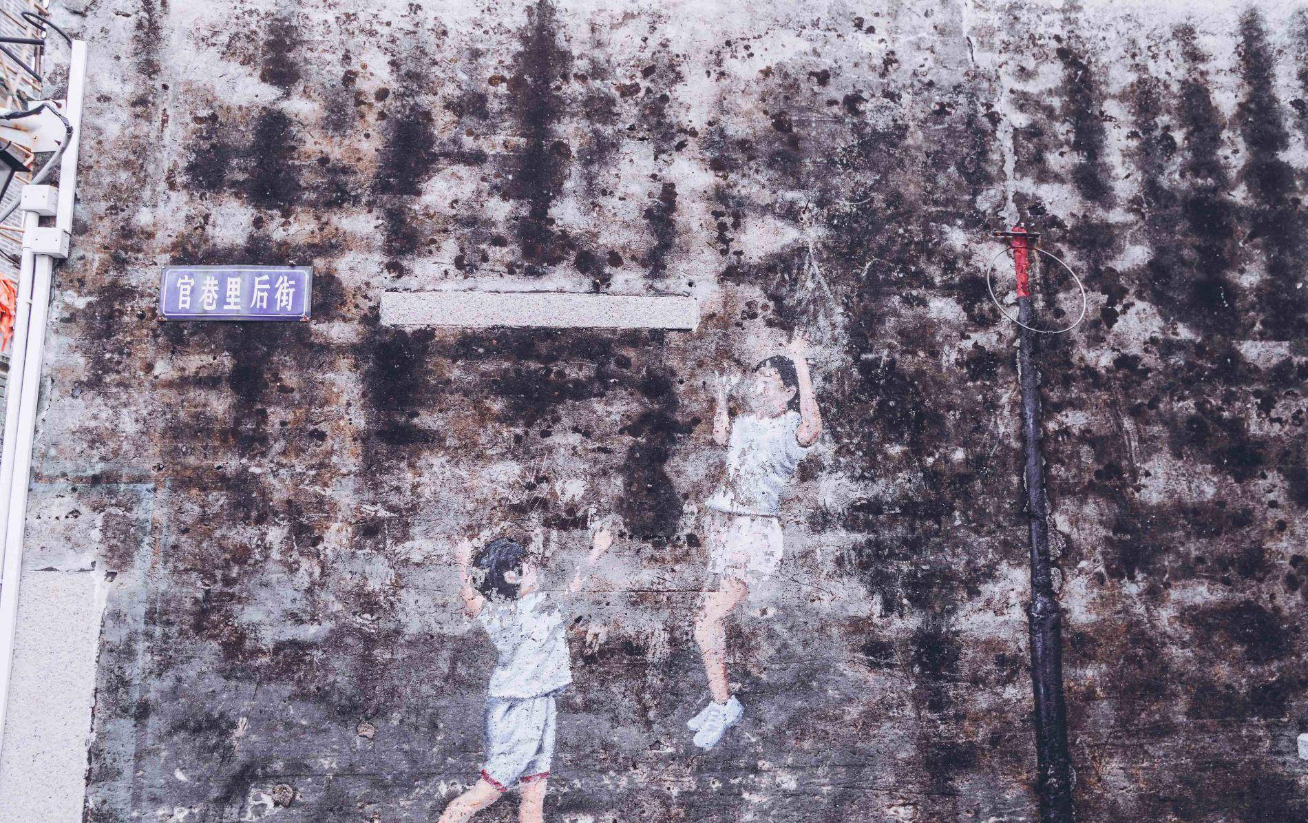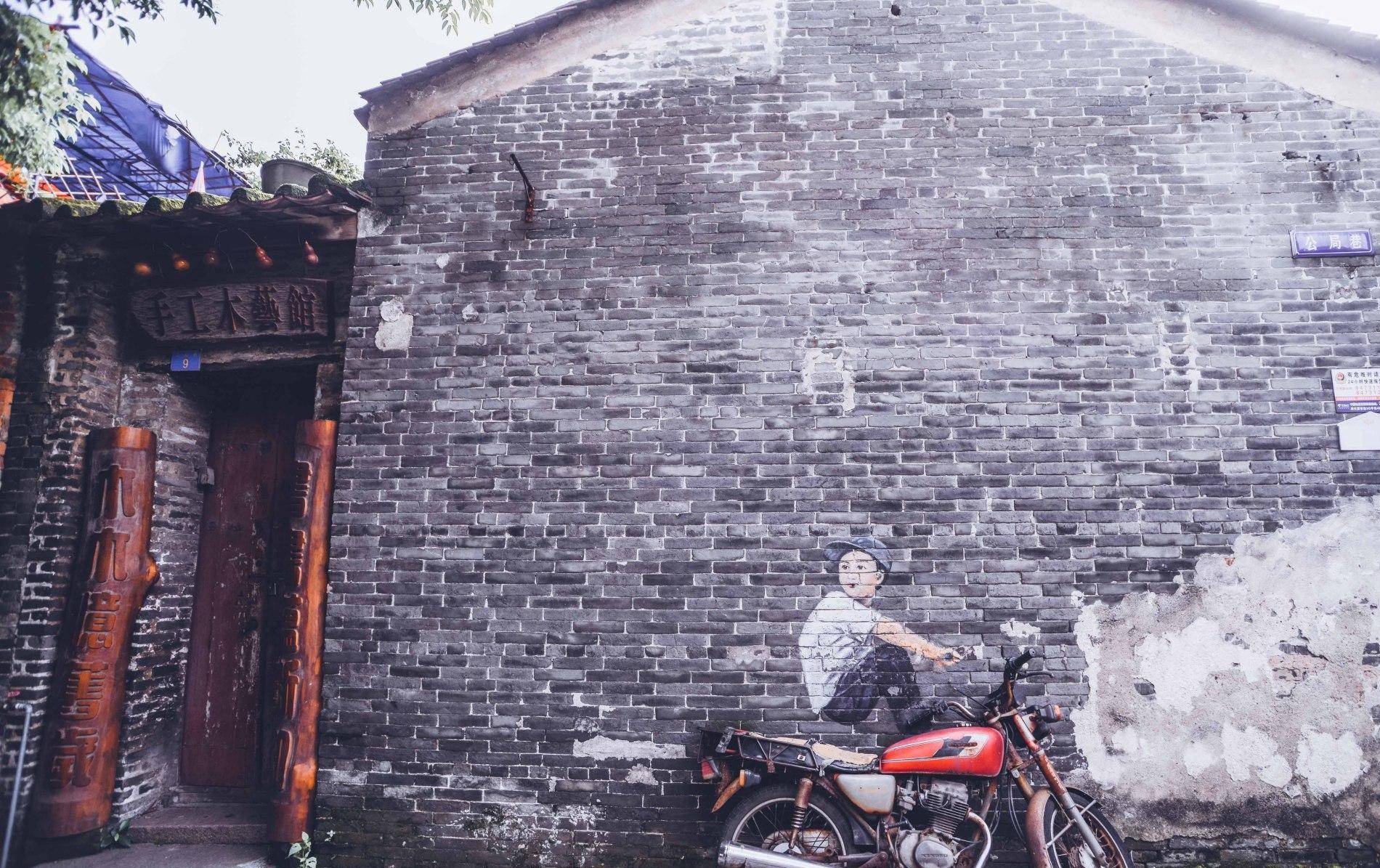 槟城涂鸦最有名的涂鸦就是那副姐弟两踩单车,在沙湾古镇的官巷里大街,也有这么一幅,不过因为墙壁用材的不同,沙湾古镇这幅有点斑驳,但范儿更加有岁月感。