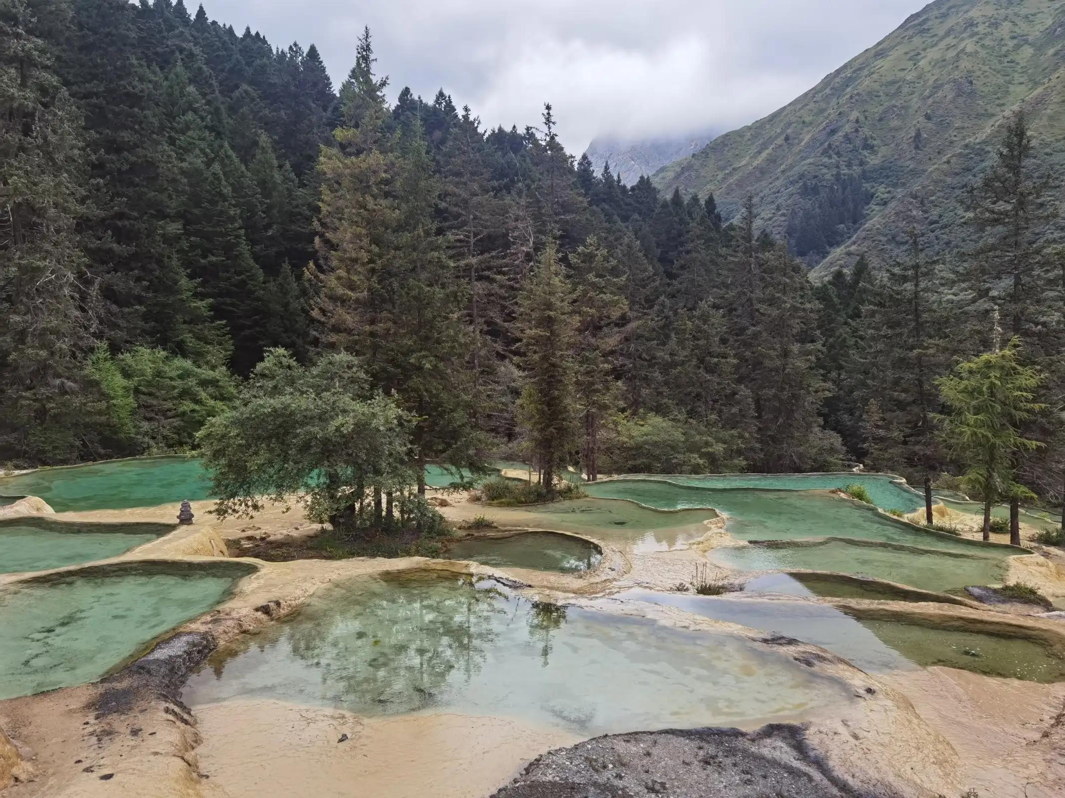 岷山雪水和富含碳酸钙的岩溶水从地表倾泻而下,不断从山谷中渗漏出来。随着水流的速度、地势的起伏、枯枝、石头的隐藏,形成了一系列石灰华堤坝,这就是所谓的“利德湖,筑坝”。耀明有2000多个梯田湖,最大的有数百平方米,最小的只有蛋壳大小,最深可达3米,浅的不足一米。几厘米。以各种形式。湖周围的群山被土耳其古树环绕,湖中光影的倒影令人难忘。