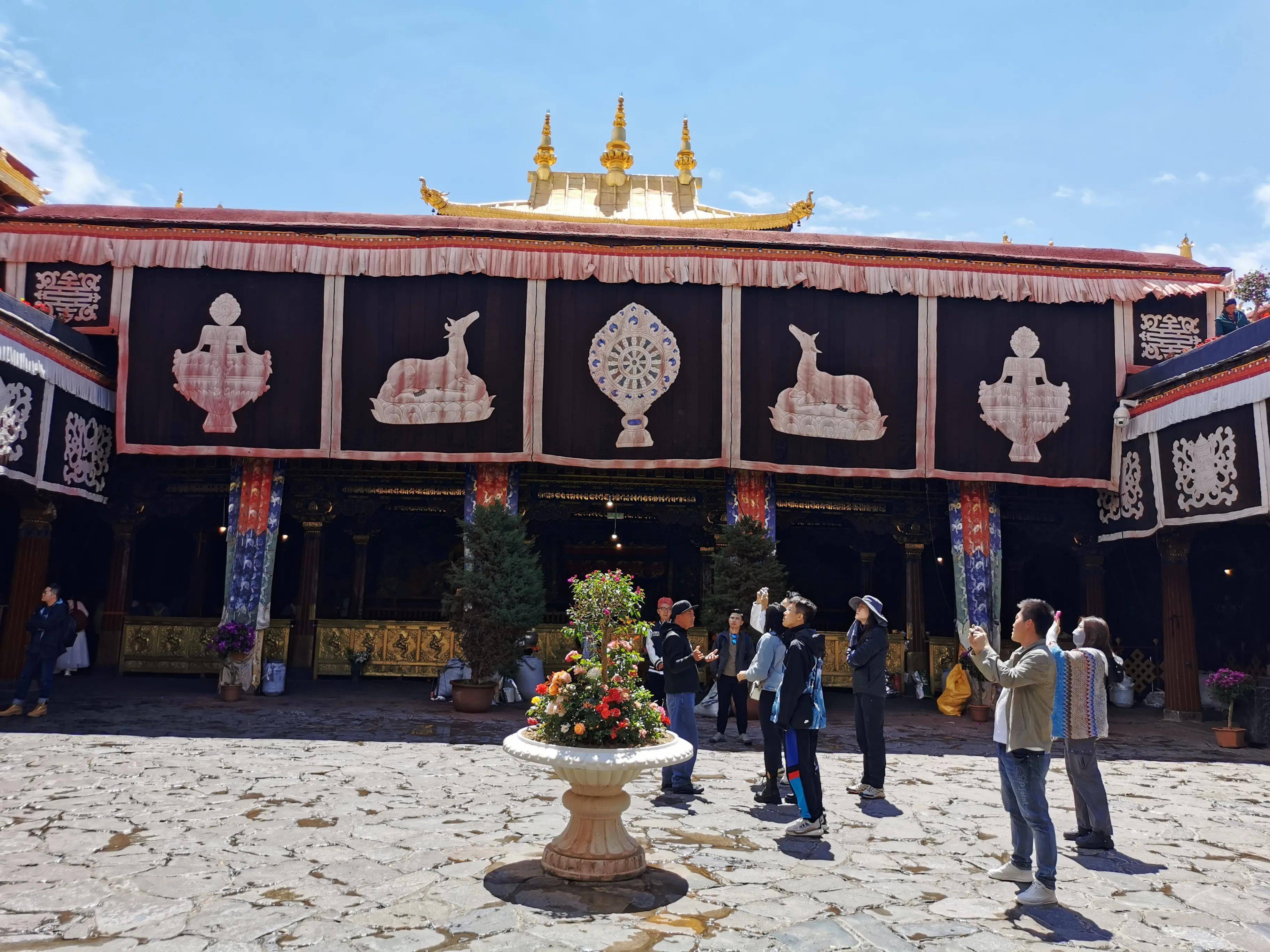 入口处进入庭院可以拍照,但是进入大昭寺正殿就不能拍照了。大昭寺是在松赞干布时期文成公主选定的地点建造的。因为有大昭寺,所以八廓街和拉萨城就在那里。大昭寺应该是西藏最高的寺庙。