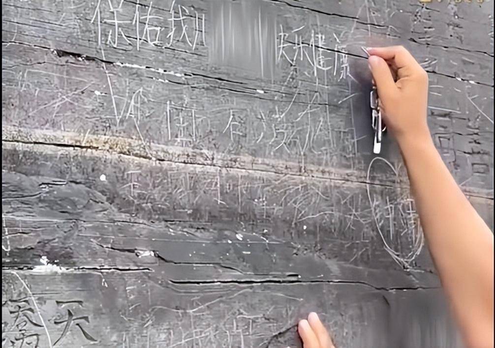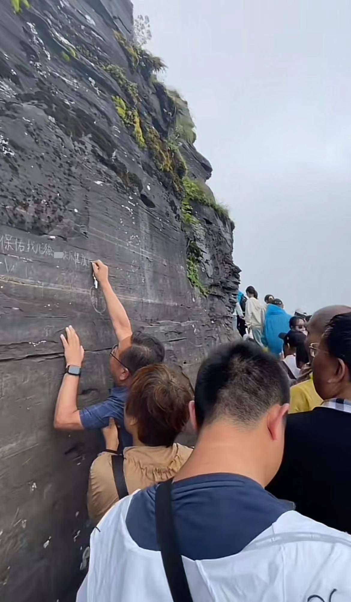 网友发布的视频显示,4月18日,梵净山区,一名男子在石墙上刻下“愿我儿子徐某幸福健康”的字样。视频剪辑师称,他在现场观看拍摄时,看到涉事游客已经快把石墙上刻的字写完了。