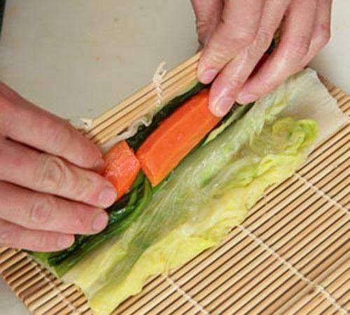 Step2:取寿司卷帘将山东白菜平铺,放菠菜与红萝卜向内卷起,打开后再切成约4公分长的蔬菜卷。