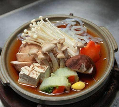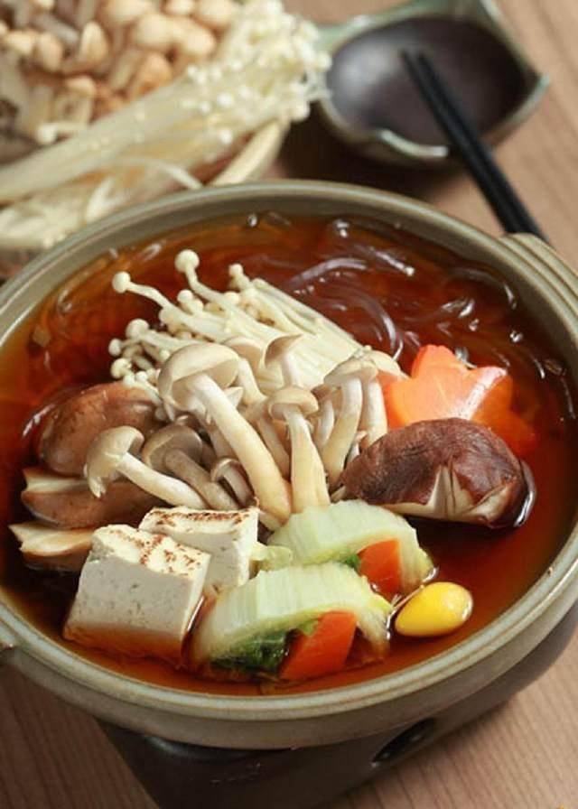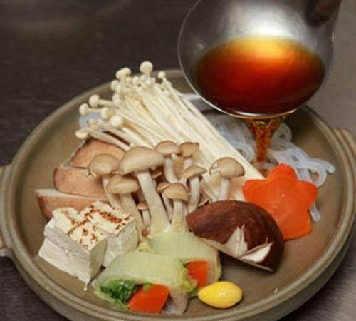【野菜陶板冬粉】材料:山东白菜2大片、红萝卜1/4根、菠菜1小把、杏鲍菇30克、金针菇40克、香菇半朵、柳松菇30克、板豆腐30克、白果1颗、日本冬粉40克、素高汤180c.c。调味料:味醂30c.c、酱油30c.c.