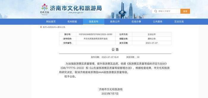 然而,济南泉城茶博园获得国家AAA级旅游景区不足五年就被“摘牌”,原因于检查结果有关。
