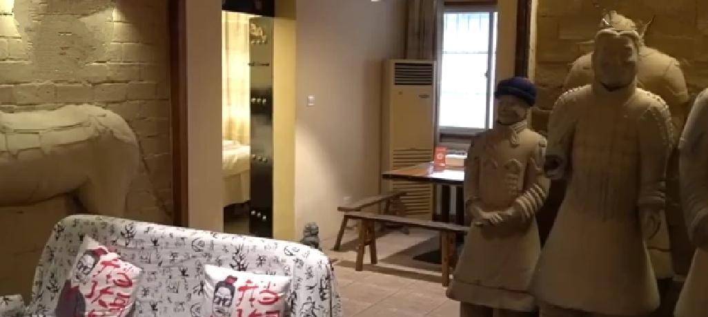 从网络流传的视频中可以看出,这家兵马俑主题酒店设计着实新颖,十分吸引眼球。房间内摆放着高大的兵马俑模像,并且正对着床,房间里的灯罩是设计为编钟的形状,就连抱枕都印着兵马俑的卡通形象,风格奇特,看得出来,酒店主着实是花了很多心思装潢的。