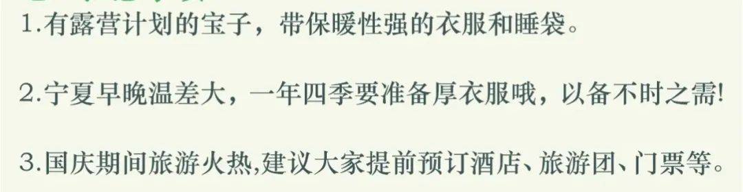 1、宁夏等西北地区位于我国西北内陆,气候以温带大陆性气候为主,日照强度与昼夜温差较大,紫外线强,日照较长,请游客根据自身情况,带足御寒衣物,水壶、遮阳伞、墨镜、太阳帽和特级防晒油以做外出护肤之用。