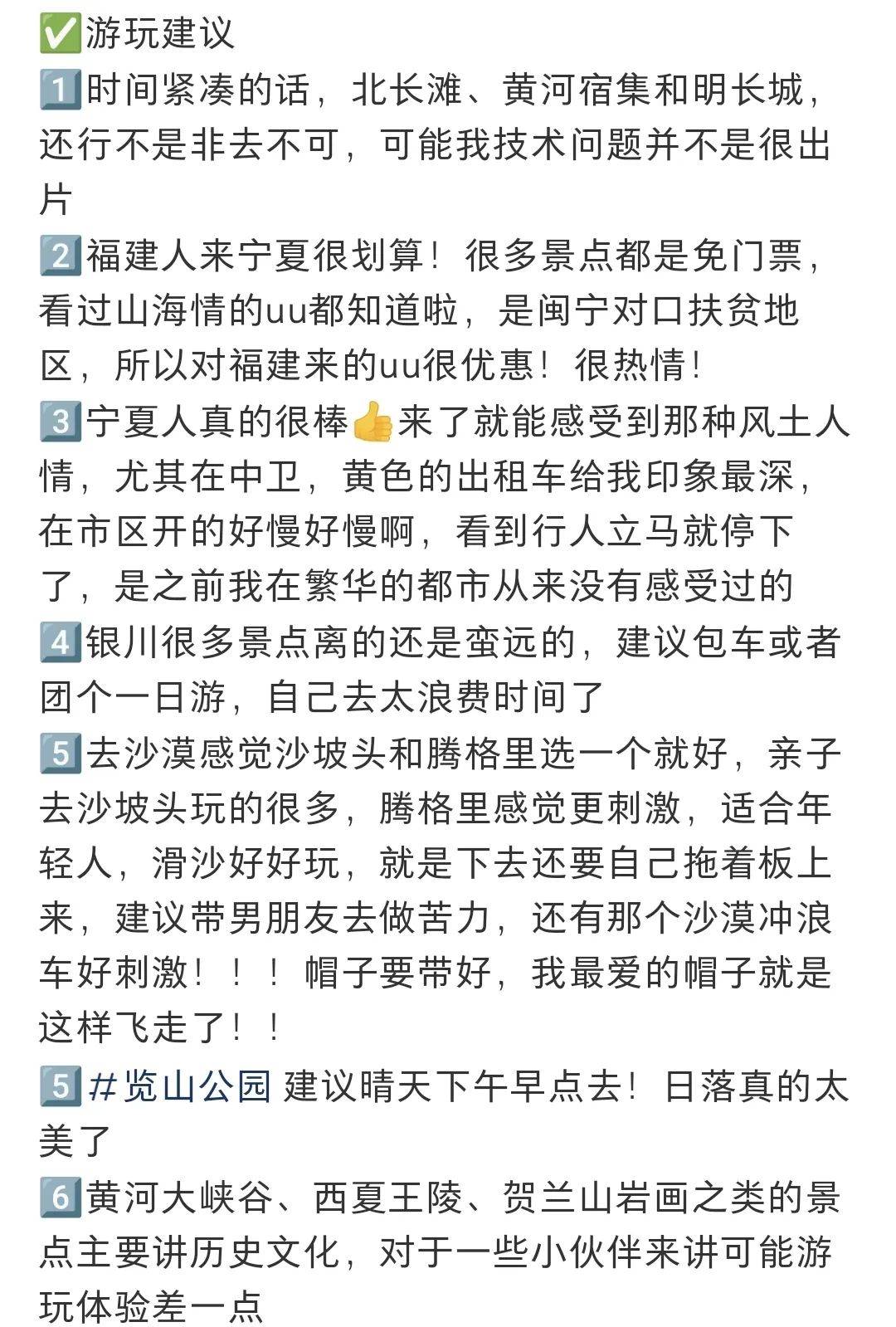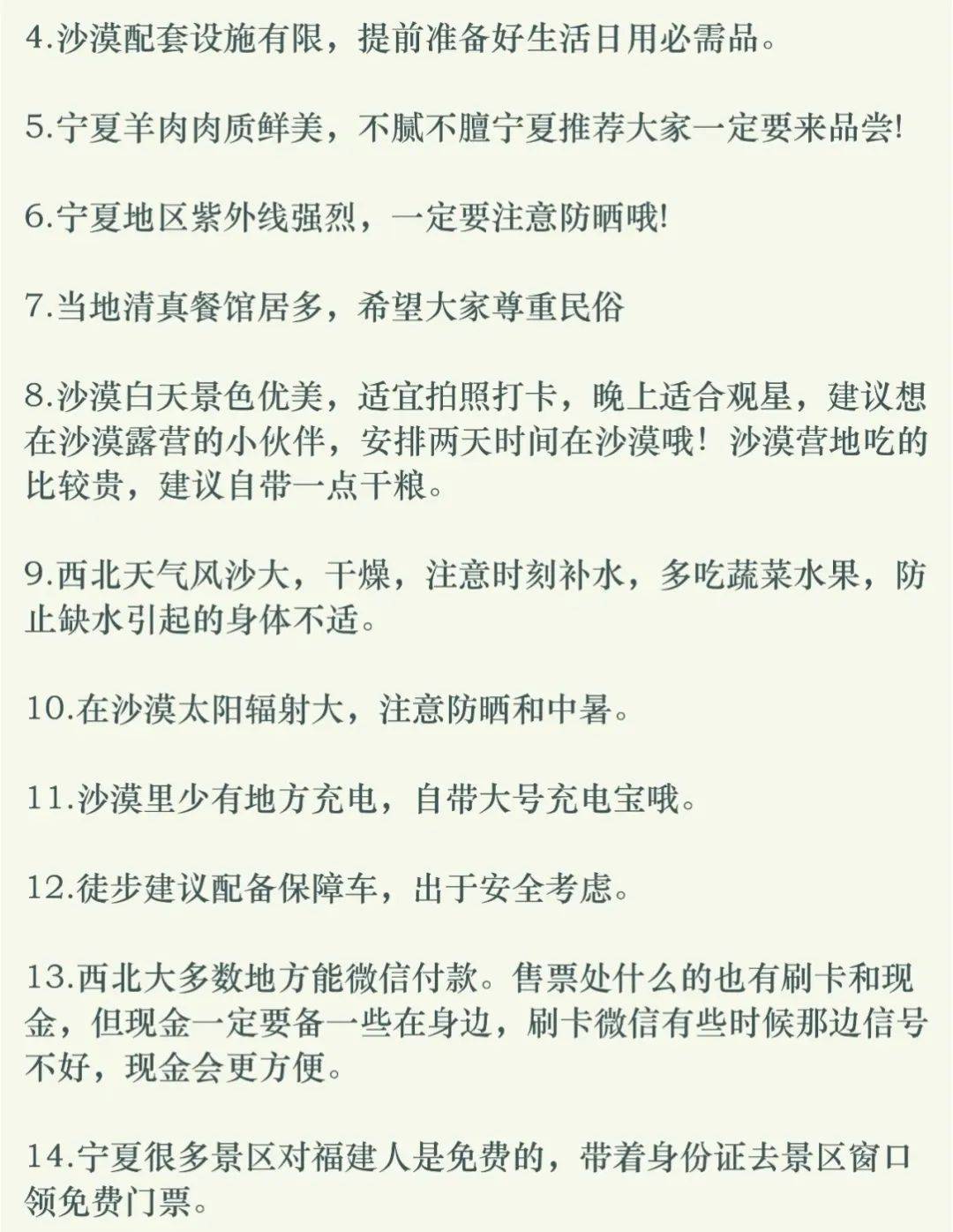 2、宁夏部门地区风沙比较大,一些景区(如沙湖、沙坡头等)沙子较多,注意保护好照相机,最好随照、随关镜头盖;