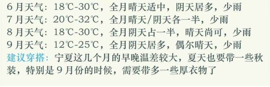7、宁夏位地西北内陆,气候以温带大陆气候为主,日照强度与昼夜温差较大,宁夏气温一般在15—28摄氏度,即使在夏季也建议您带两件较厚的衣物,请游客根据自身情况带足御寒衣服,及时增添衣物,有备无患!