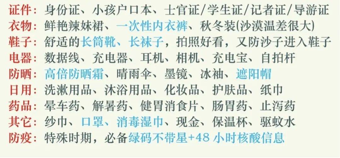 沙漠中昼夜温差很大,经多准备一些衣物备用。经随身携带一些防晒用品,穿浅色抗紫外线的衣服。