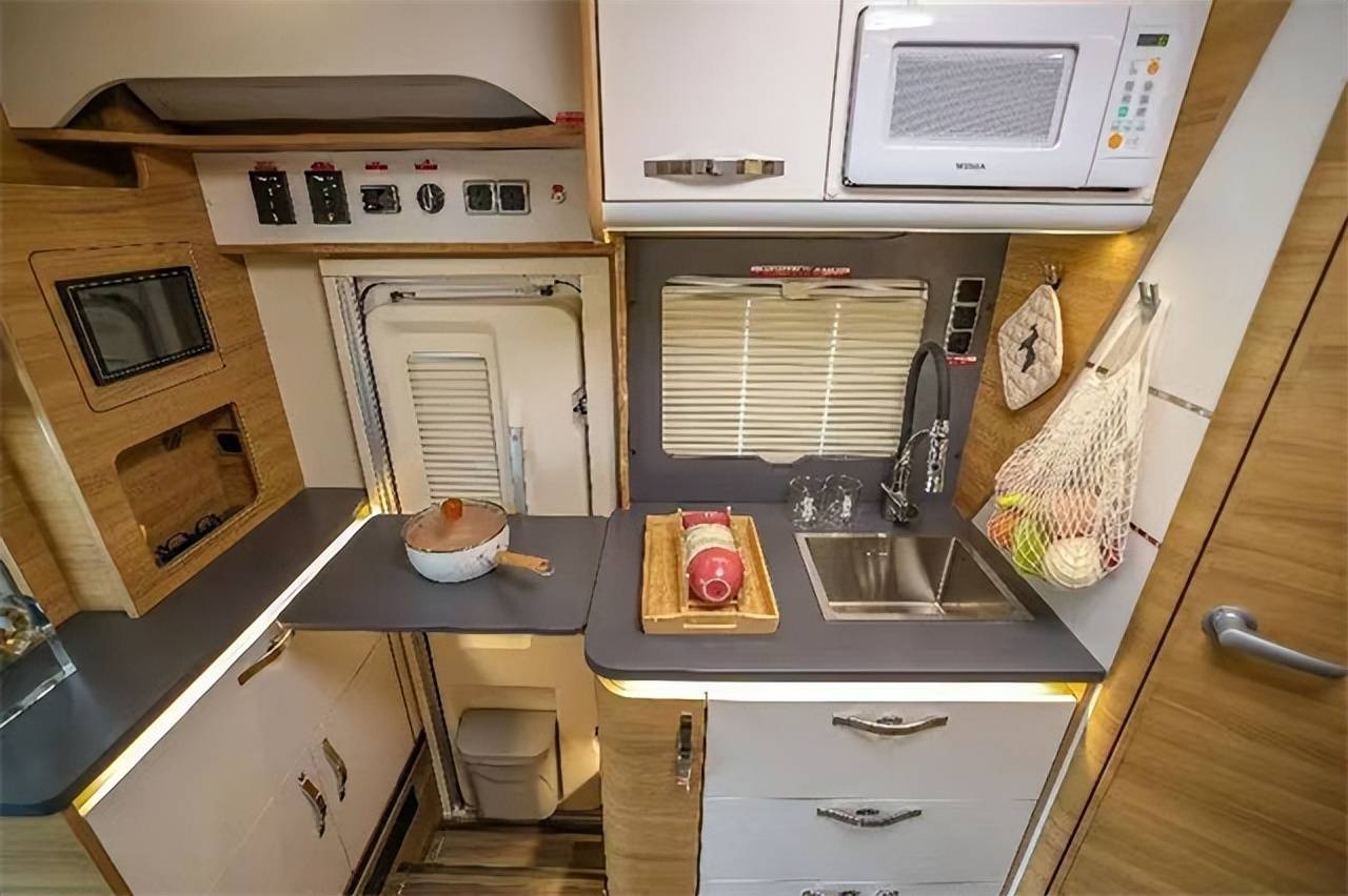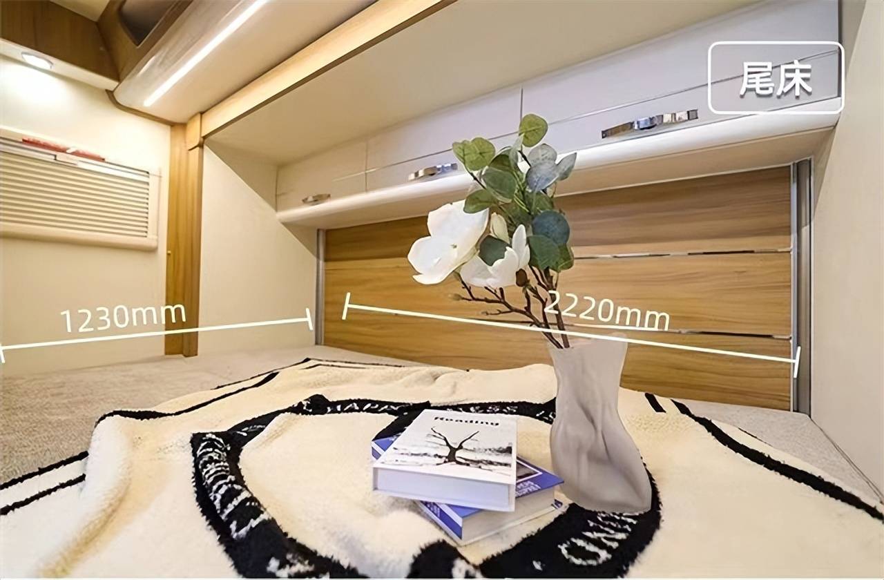 尾部休息区正好位于拓展处,拓展后床铺尺寸更宽敞。床铺尺寸为2220×1230mm,可以容纳双人休憩。床侧贴心配有车窗、床头阅读灯、充电口等,方便车主娱乐或阅读使用。顶部配有储物吊柜,方便收纳日用物品。另外床铺一侧配有穿衣镜,爱美的女主人可以轻松在车内进行穿衣搭配,镜子下方配有洗衣机,方便车主户外洗衣。