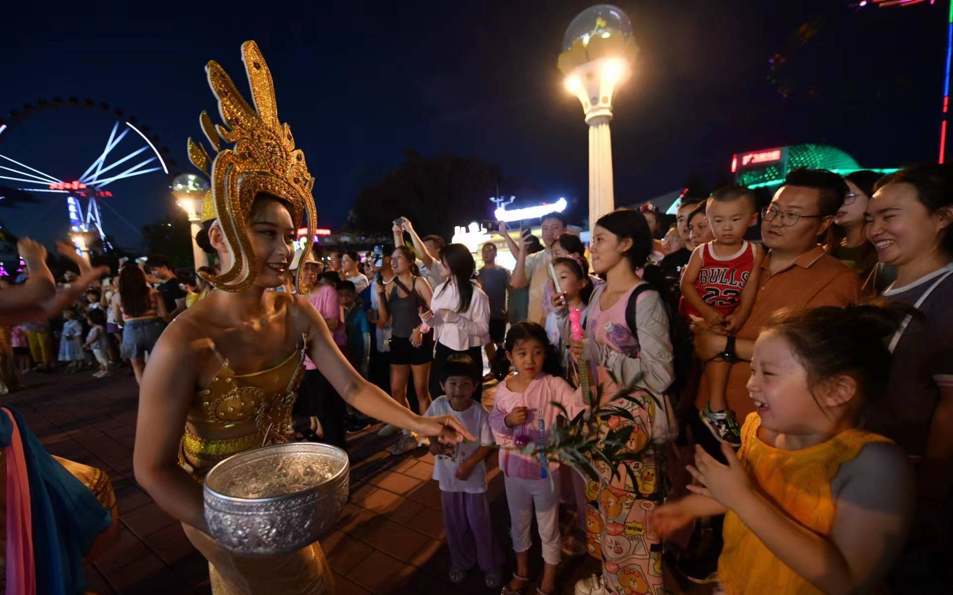 游乐园夜场,游客和演员进行互动。新京报记者 浦峰 摄