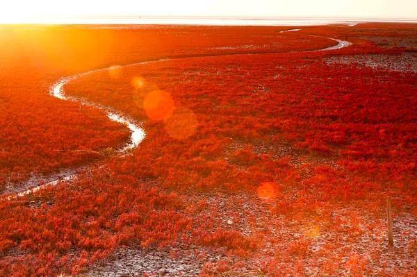 红海湾国家风景廊道,位于盘锦市区西南约30千米的渤海之滨,地处辽河入海口东侧,面积20多平方千米,栖息着丹顶鹤、黑嘴鸥等236种鸟类。它以全球保存最完好、规模最大的湿地资源为依托,以举世罕见的红海滩、世界最大的芦苇荡为背景。