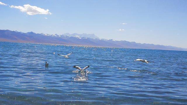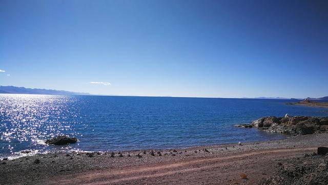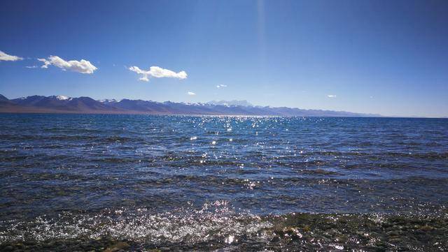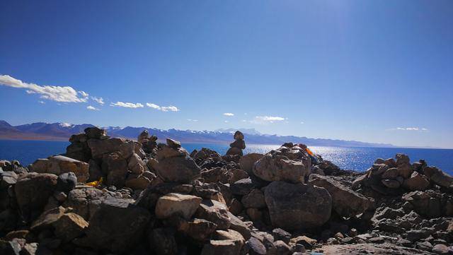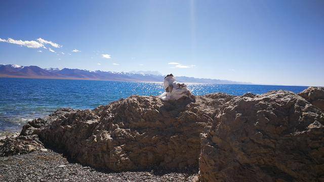 这里的湖面,碧波荡漾,一望无际,阳光洒在湖面上,金光闪闪,几只水鸟在湖面上嬉戏,追逐!湖边的沙滩上还有几只牦牛!远处雪山耸立在蓝天白云之下!站在湖边的岩石上,远眺远方,不觉间竟留下了两行清泪!跋山涉水,风餐露宿,一路转山转水转佛塔,不为修来生,只为这一眼!只为这一诺,只为这一结!