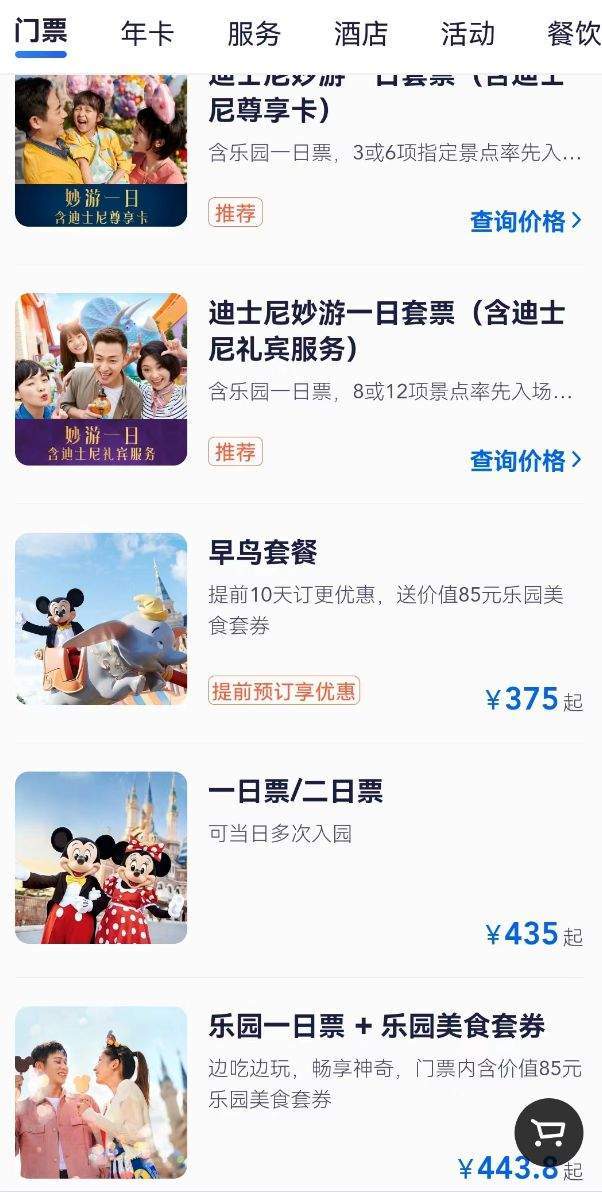 此外,上海迪士尼度假区APP中,除了出售门票之外,还包括酒店、餐券订购等内容。此外,乐园美食券、一日套票、早年套餐、二日票、早享卡、尊享卡等,价格也在百元到千元不等。