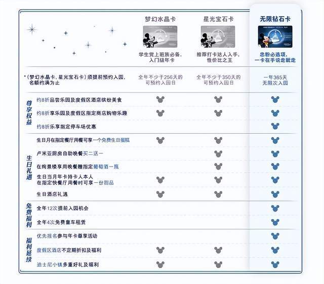 取消年卡意味着什么呢?一位办理过上海迪士尼乐园年卡的用户向开菠萝财经介绍,上海迪士尼的年卡分为梦幻水晶卡、星光宝石卡和无限钻石卡三种,分别对应着不同的优惠,包括购物打折、提前入园、租赁童车、多次游玩机会等。如果是经常去迪士尼的人,办理年卡是非常合适的,一个月去一次,半年就回本了。