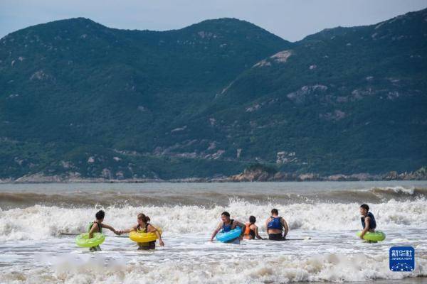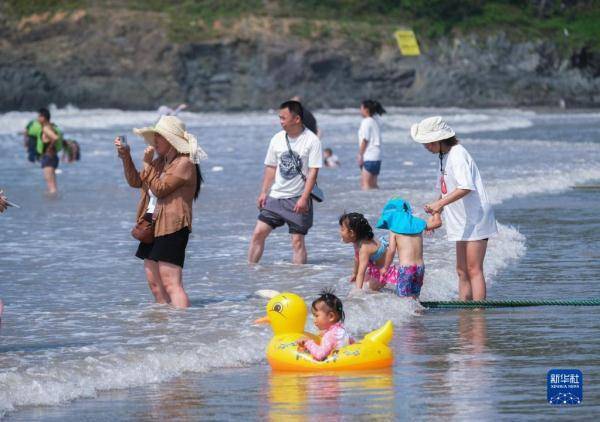 7月8日,游客在朱家尖南沙景区的沙滩上戏水。