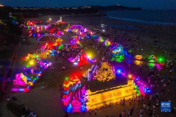 7月8日,这是朱家尖南沙景区灯光映照下的舟山国际沙雕节沙雕作品(无人机照片)。