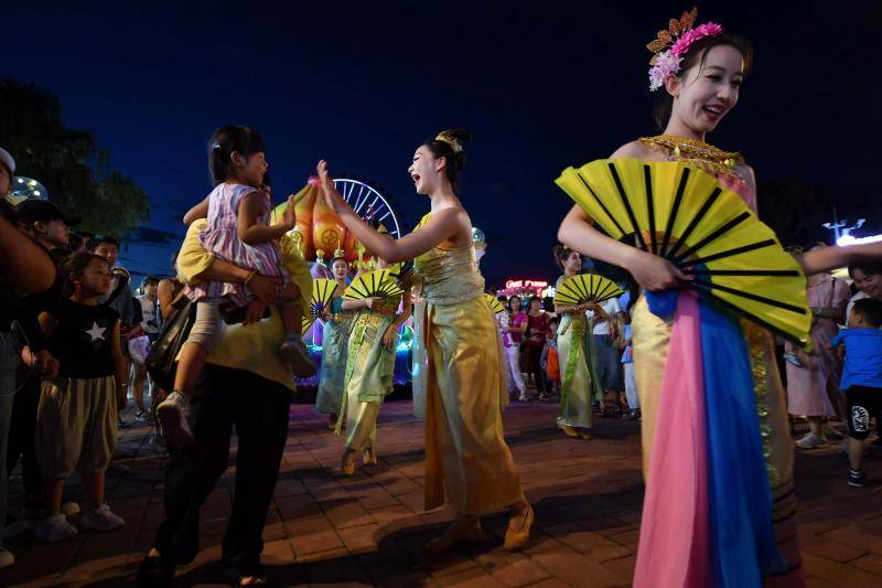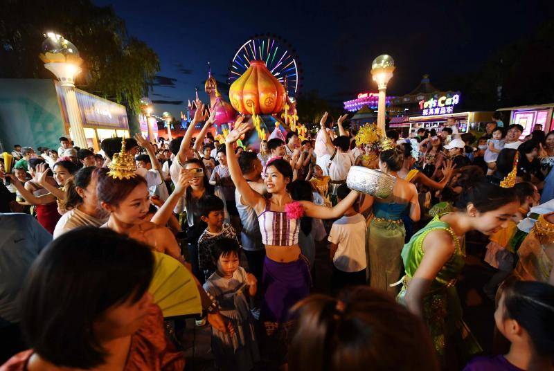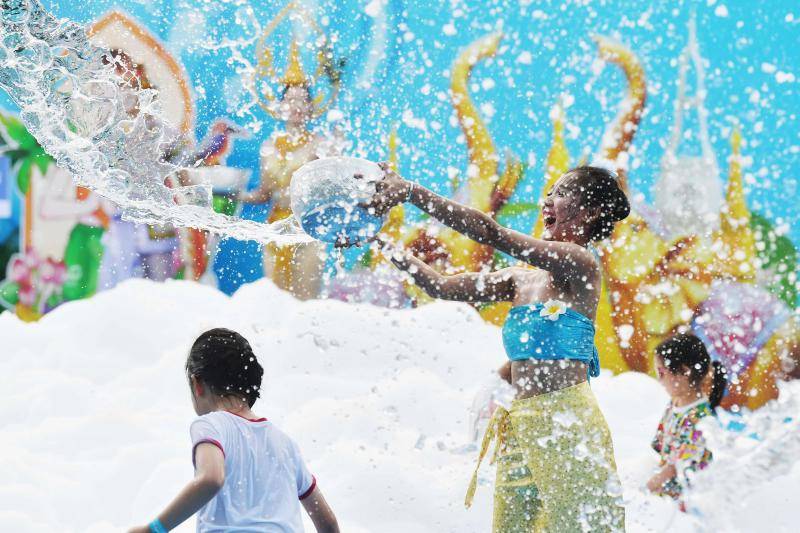 在园区入口处,一场异域风情的迎宾秀拉开帷幕,趣味萌态的卡通玩偶以及身穿东南亚风情服饰的演员们热情迎客,帮游客开启欢乐之旅。今年,游乐园在东园新增了星光奇幻泼水狂欢区和西园奇境星球亲子泼水区,游客可使用水枪、水桶、水球等装备来一场酣畅淋漓的水仗,也可以伴随着傣族风情舞,来一场肆意撒欢的泼水狂欢。